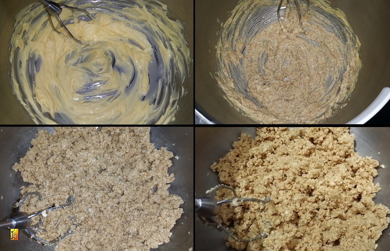 無鹽牛油 83g → 沖繩黑糖 18.3g + 黃糖 19.9g + 鹽 2.8g → 奶粉 27.7g → 麥皮 83g → 椰絲 10g → 低筋粉 83g + 泡打粉1.1g→ 奶 30g → 紅莓乾 20.6g → 核桃 30g → 玉桂粉少許