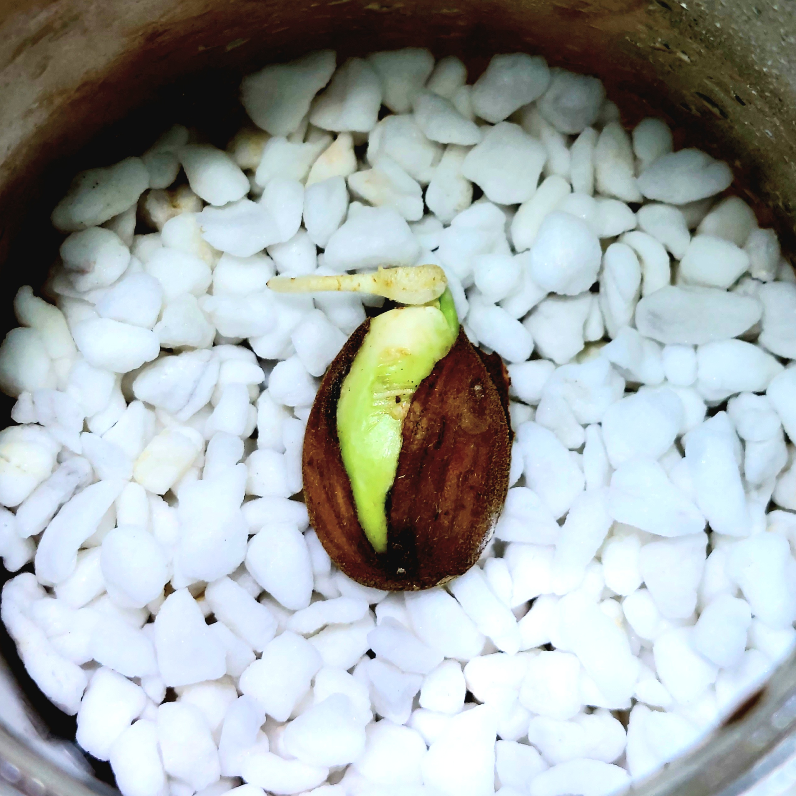 經過上次種植韓國柿的經驗,將韓國桃核直接放入玻璃瓶內潮濕的珍珠岩表面,然後蓋上,核沒有經過任何處理。